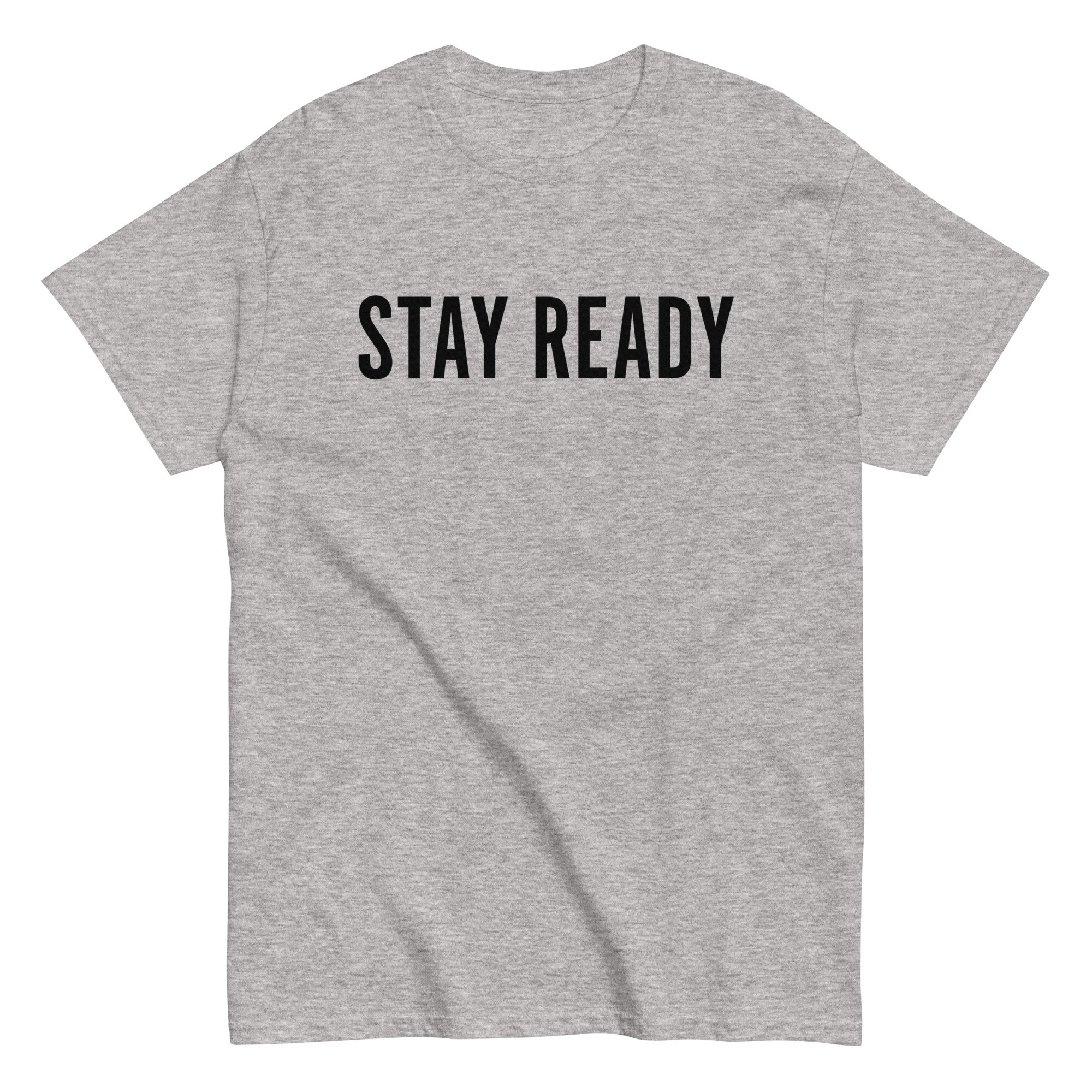 Shop › STAY READY T-SHIRT Image 1 of 2 Image 2 of 2 STAY READY T-SHIRT from $15.00 • Sport Grey is 90% cotton, 10% polyester • Fabric weight: 5.0–5.3 oz/yd² (170-180 g/m²) This product is made especially for you as soon as you place an order! Size: Select Size S M L XL 2XL 3XL Add To Cart Added! • Sport Grey is 90% cotton, 10% polyester • Fabric weight: 5.0–5.3 oz/yd² (170-180 g/m²) This product is made especially for you as soon as you place an order!